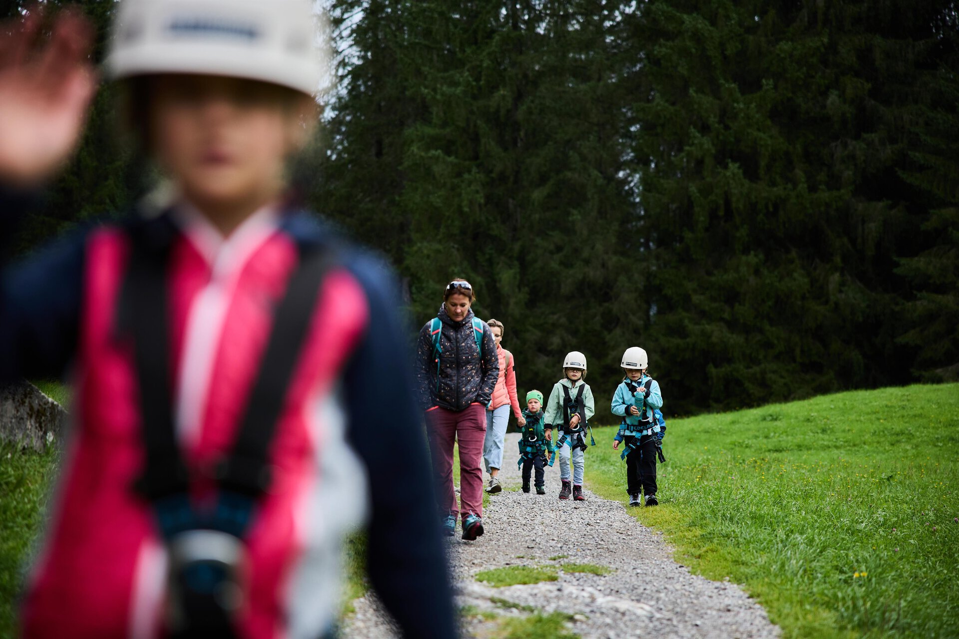 Eine Gruppe von Kindern wandert auf einem Schotterweg durch einen Wald. Sie tragen Helme und sind gut ausgestattet für ein Abenteuer in der Natur. | © Kleinwalsertal Tourismus | Oliver Farys