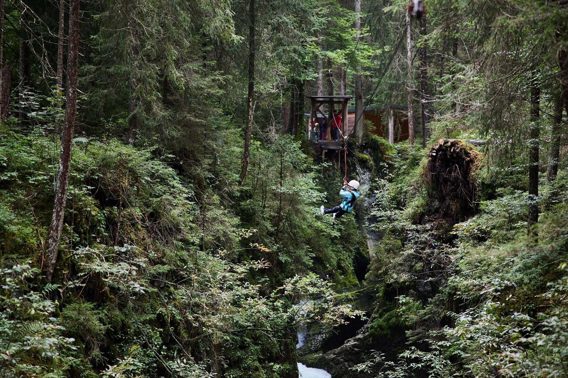 Das Abenteuer fordert Dich beim Klettern im Klettergarten, beim Bachüberqueren auf der Seilbrücke, am Flying Fox oder beim Abseilen aus schwindelerregenden 40 Metern Höhe.